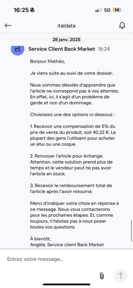Jag vill uttrycka mitt missnöje och varna dig för att köpa från Back Market. Du köper från återförsäljare, och Back Market tvekar inte att ljuga om leveranstider. I mitt fall vilseledde de mig om leveransdatumet. När jag äntligen fick mitt paket var det trasigt. Efter många diskussioner med kundtjänsten, som naturligtvis inte ledde till något, insåg jag att de försvarade återförsäljaren framför allt annat. Jag bör påpeka att det trasiga paketet inte berodde på transporten, utan på återförsäljaren som hade skickat det i det skicket. Jag hade köpt en MacBook värd 800 euro, och processen tog över en månad. Under denna tid lämnades jag i mörkret, utan någon verklig information. Efter att ha ställts inför detta problem erbjöd kundtjänsten mig flera lösningar: - En rabattkupong på 5 %, som förmodligen skulle användas för att köpa skydd för MacBook. Med andra ord, för en dator som kostade 800 euro gav de mig 5 % för att jag skulle hålla tyst och köpa ett fodral. Det räcker med att säga att jag tyckte att detta förslag var löjligt. - En retur av MacBook för en ersättning. Väntetiden var dock inte garanterad, eftersom återförsäljaren kanske inte hade de nödvändiga delarna eller ens en ersättningsmacBook. Med andra ord kunde utbytet ta obestämd tid... för en produkt som kostar 800 euro! Väldigt professionellt, eller hur? Sammanfattningsvis avråder jag starkt från att köpa från Back Market. Deras service är oseriös, deras kundtjänst är bedrövlig och det vore bättre om du sparade dina pengar till ett mer pålitligt köp.